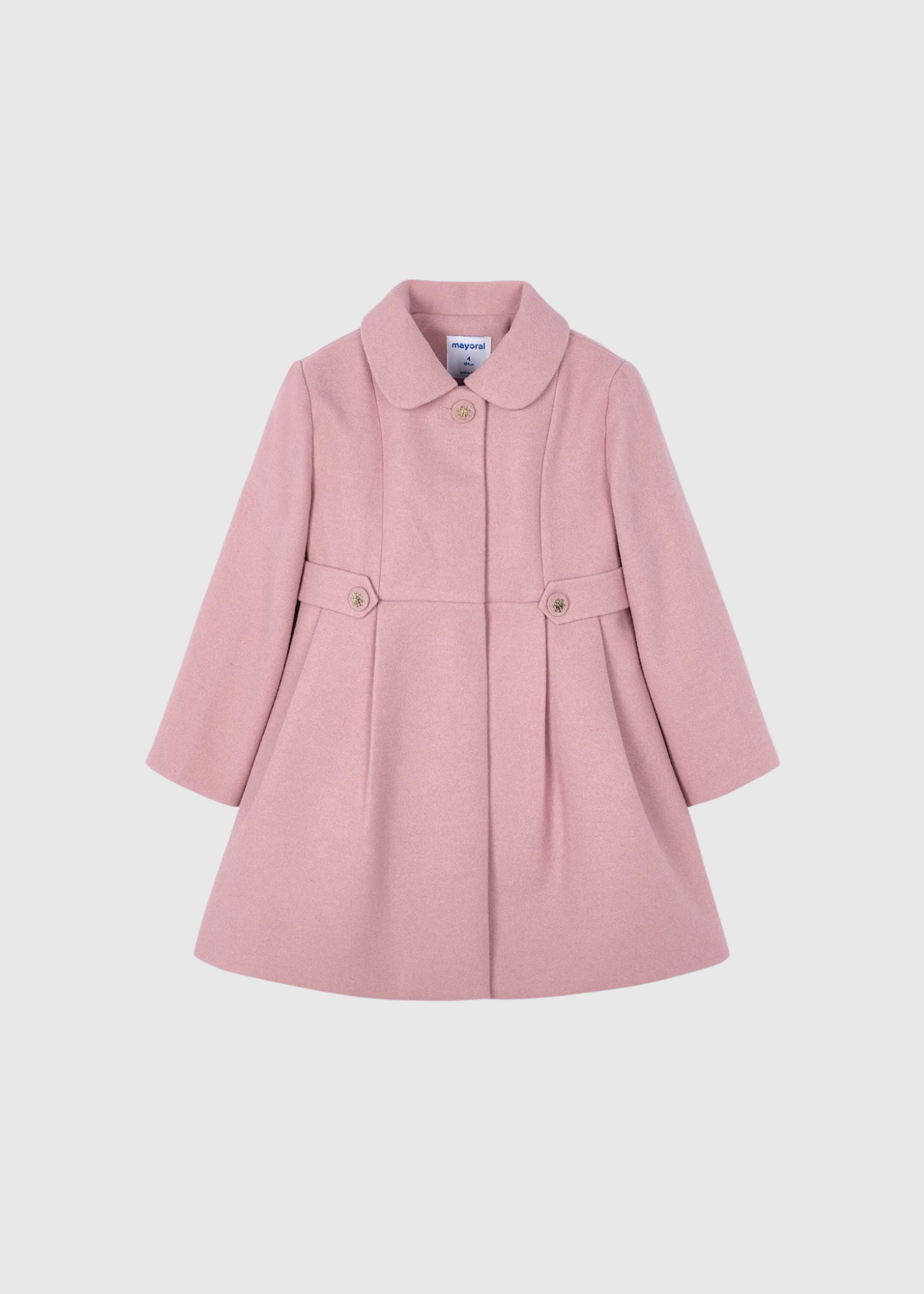 Un elegante abrigo de lana en un suave tono rosa. El diseño incluye un cuello Peter Pan y detalles de botones decorativos en la cintura que le dan un toque femenino y sofisticado.