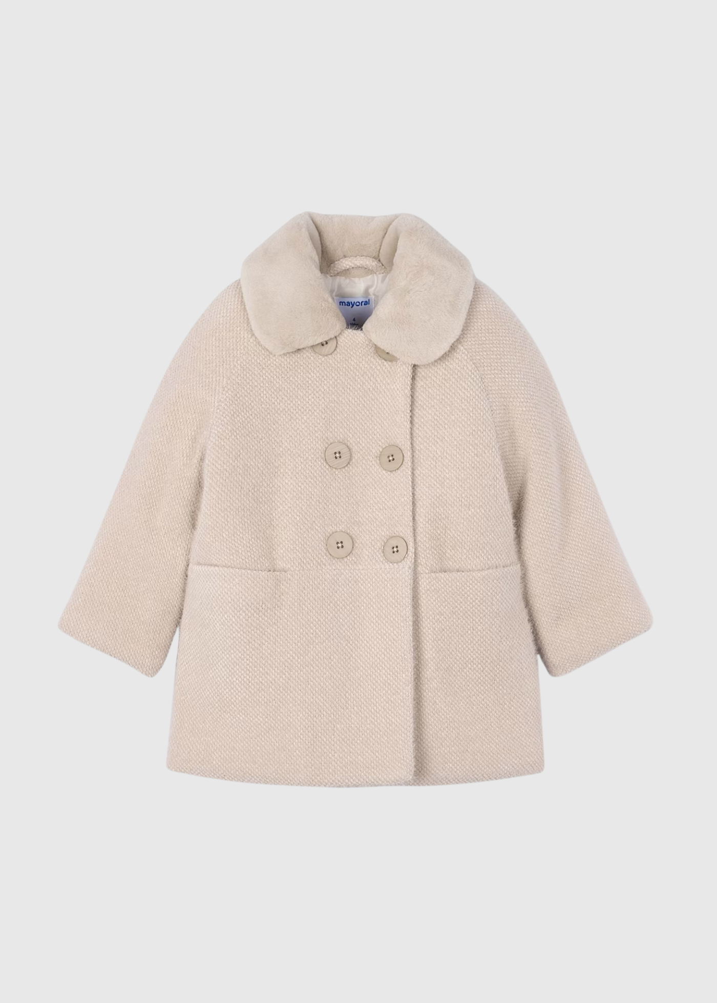 Un elegante abrigo de lana. El diseño incluye un cuello Peter Pan y detalles de botones decorativos en la cintura que le dan un toque femenino y sofisticado.