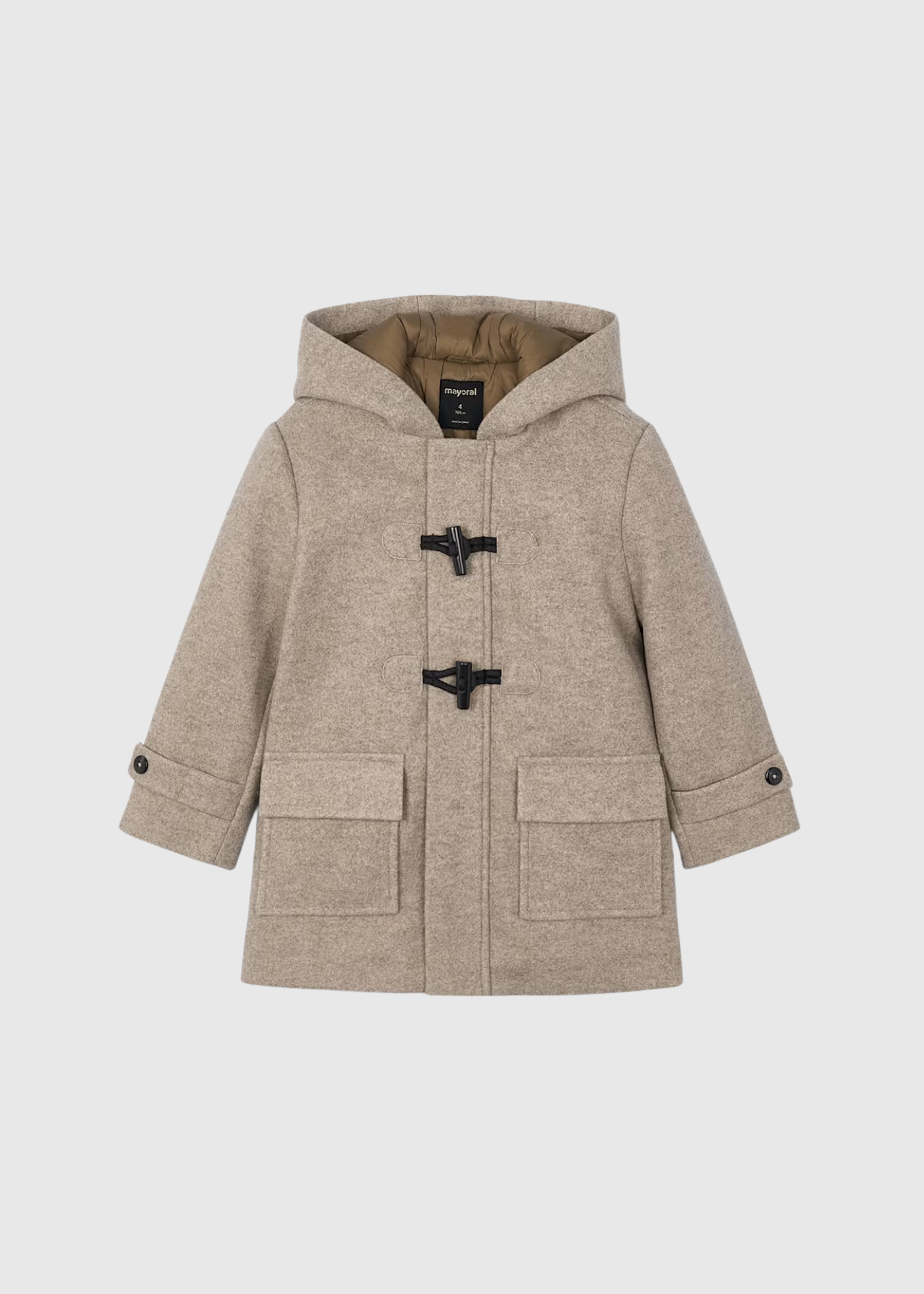 Un clásico abrigo color beige con capucha y cierre de botones de cuerno y presillas de lazo. Los grandes bolsillos de parche añaden funcionalidad y estilo.
