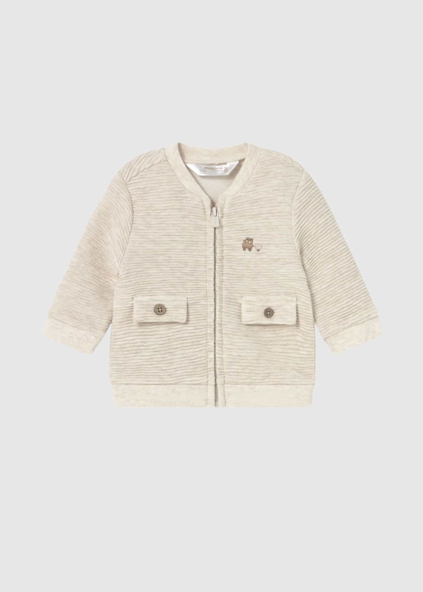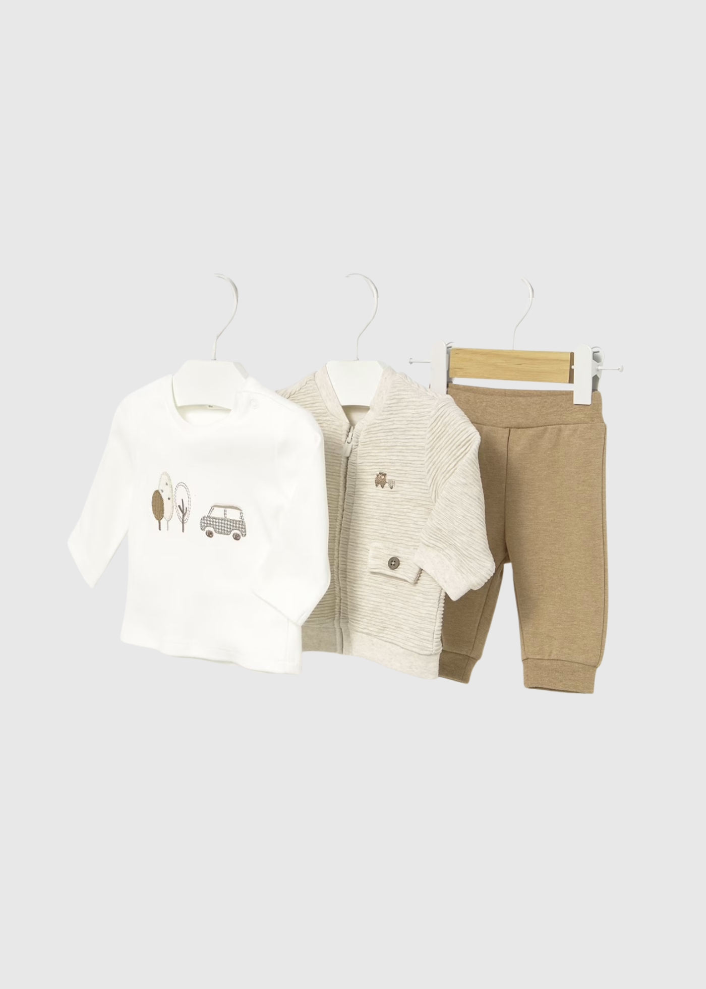 Un versátil conjunto de tres piezas con una camiseta blanca de manga larga con un gráfico de un coche y un árbol, una chaqueta a rayas de tono neutro con cremallera y cómodos pantalones marrones.