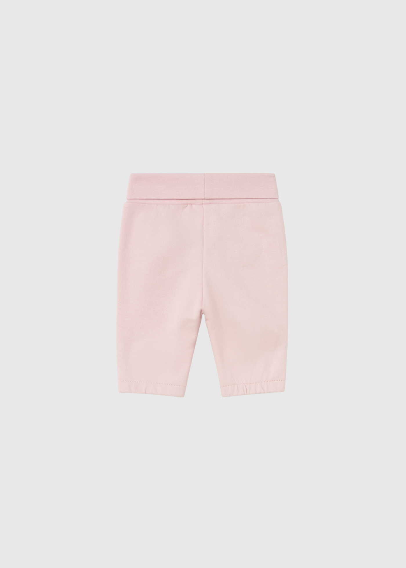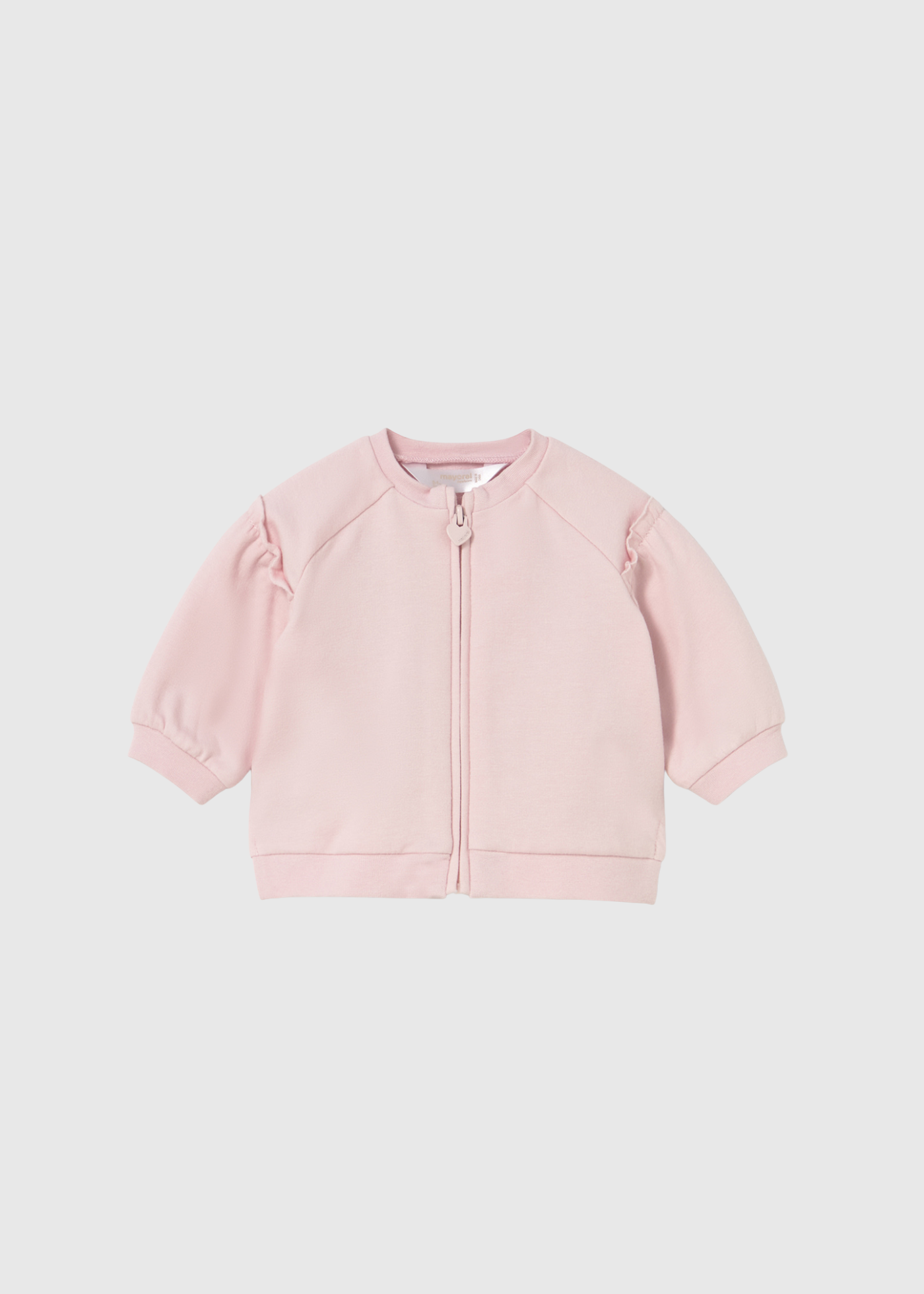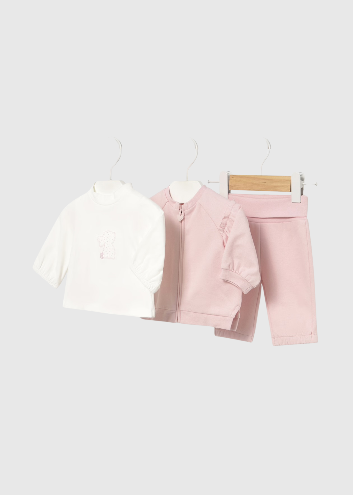 Un atuendo de tres piezas que incluye una suave camiseta blanca, una chaqueta rosa con cremallera y volantes, y pantalones jogger a juego.