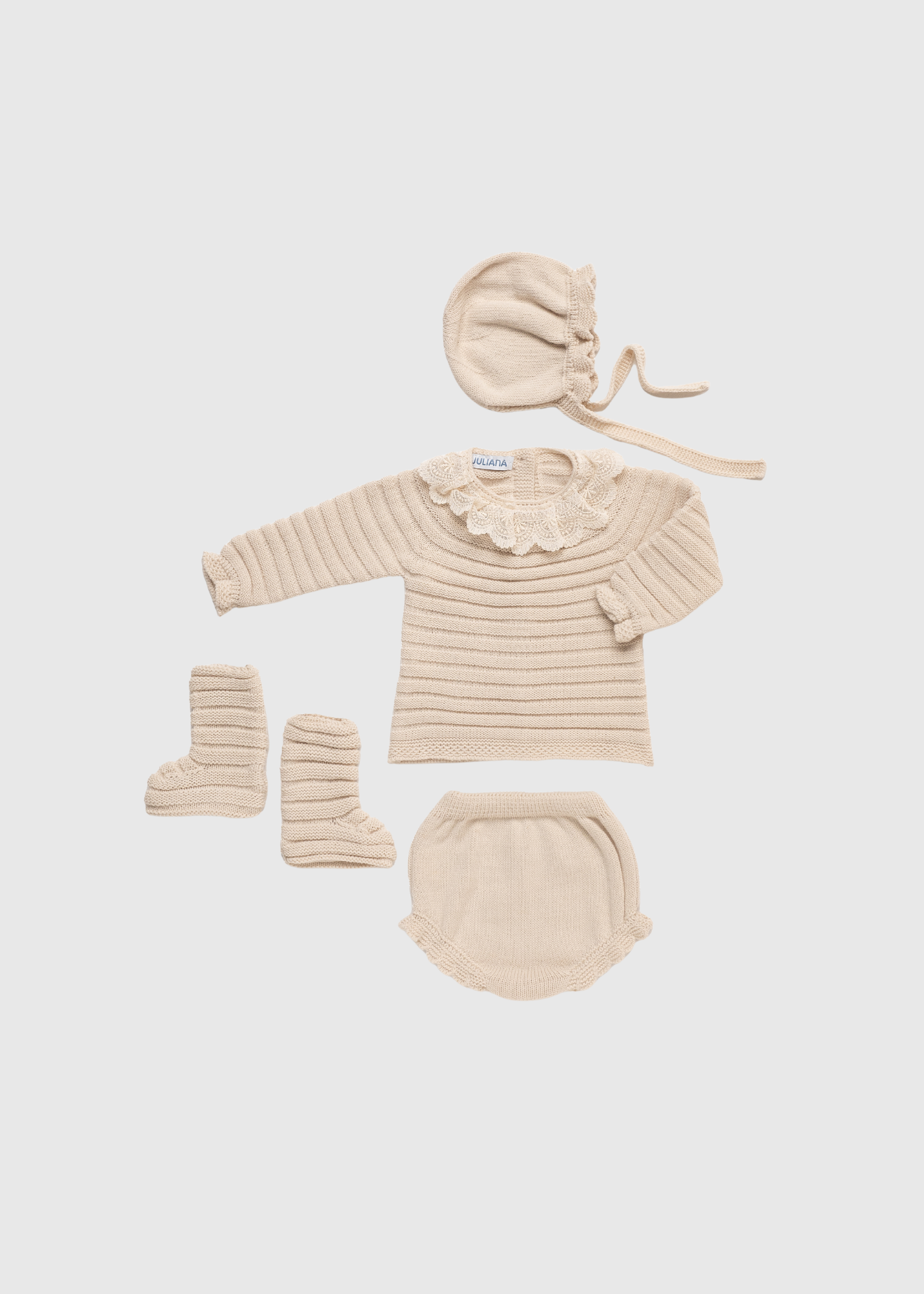 Set completo de punto en beige claro con cuello de encaje. Incluye jersey (suéter), cubrepañal (bombacho), gorro de volante y patucos (botitas).