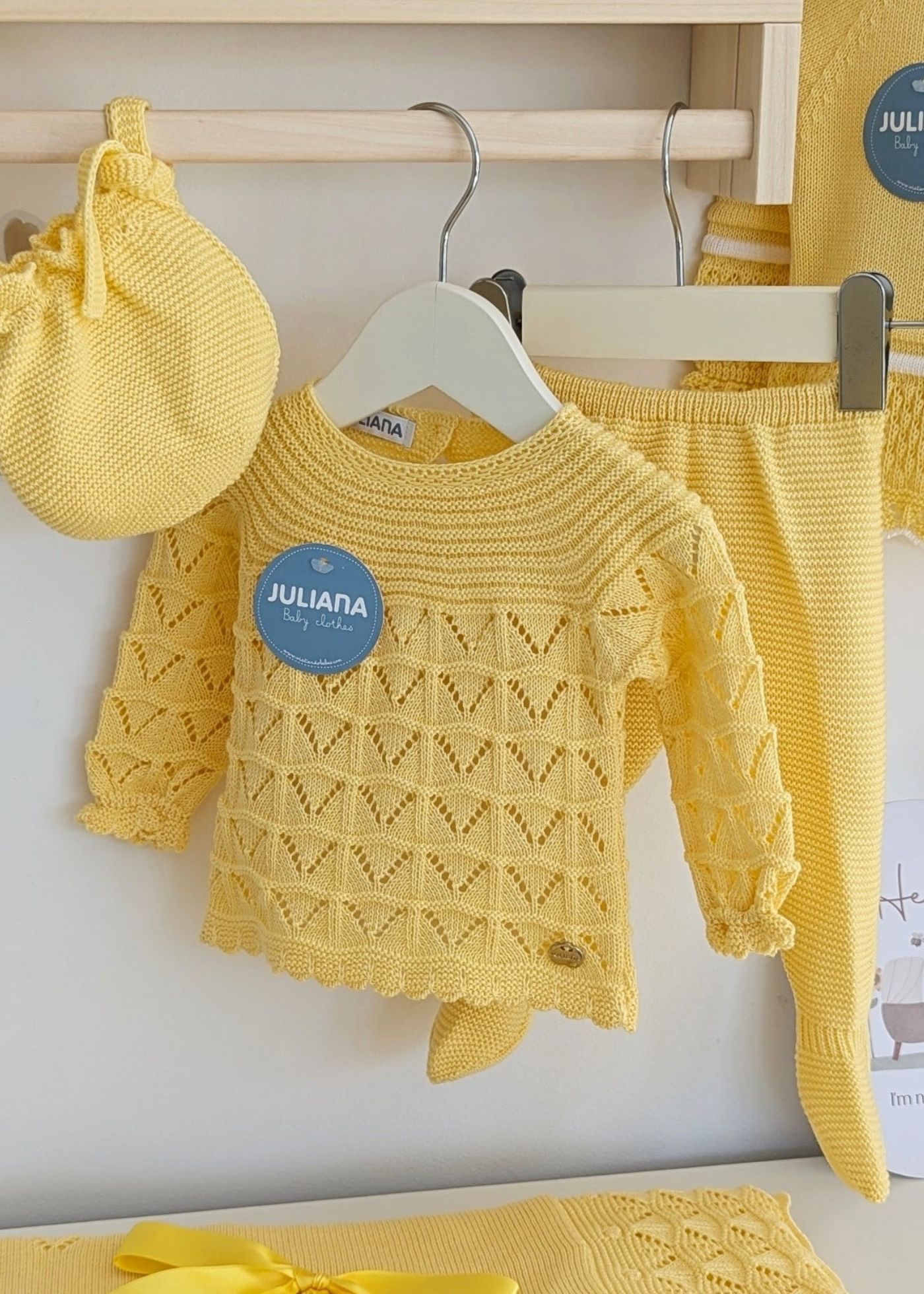 Conjunto amarillo bebé de punto con textura de rombos. Leotardo a juego, sin gorro.
