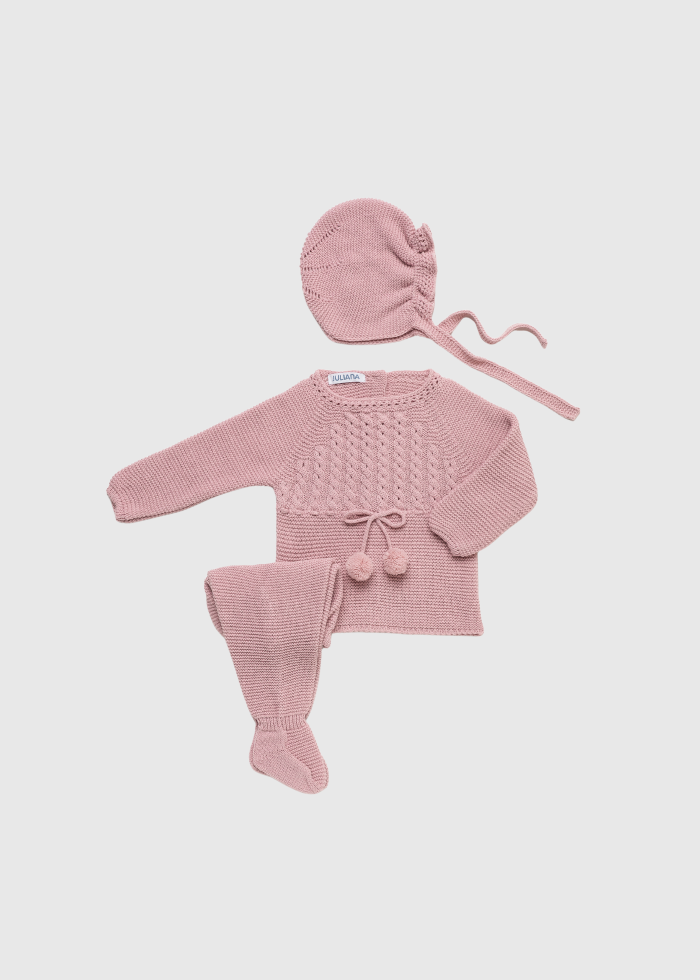 Jersey de punto rosa empolvado con diseño trenzado y lazos con pompones. Incluye leotardo/polaina de punto a juego y gorro de capota.