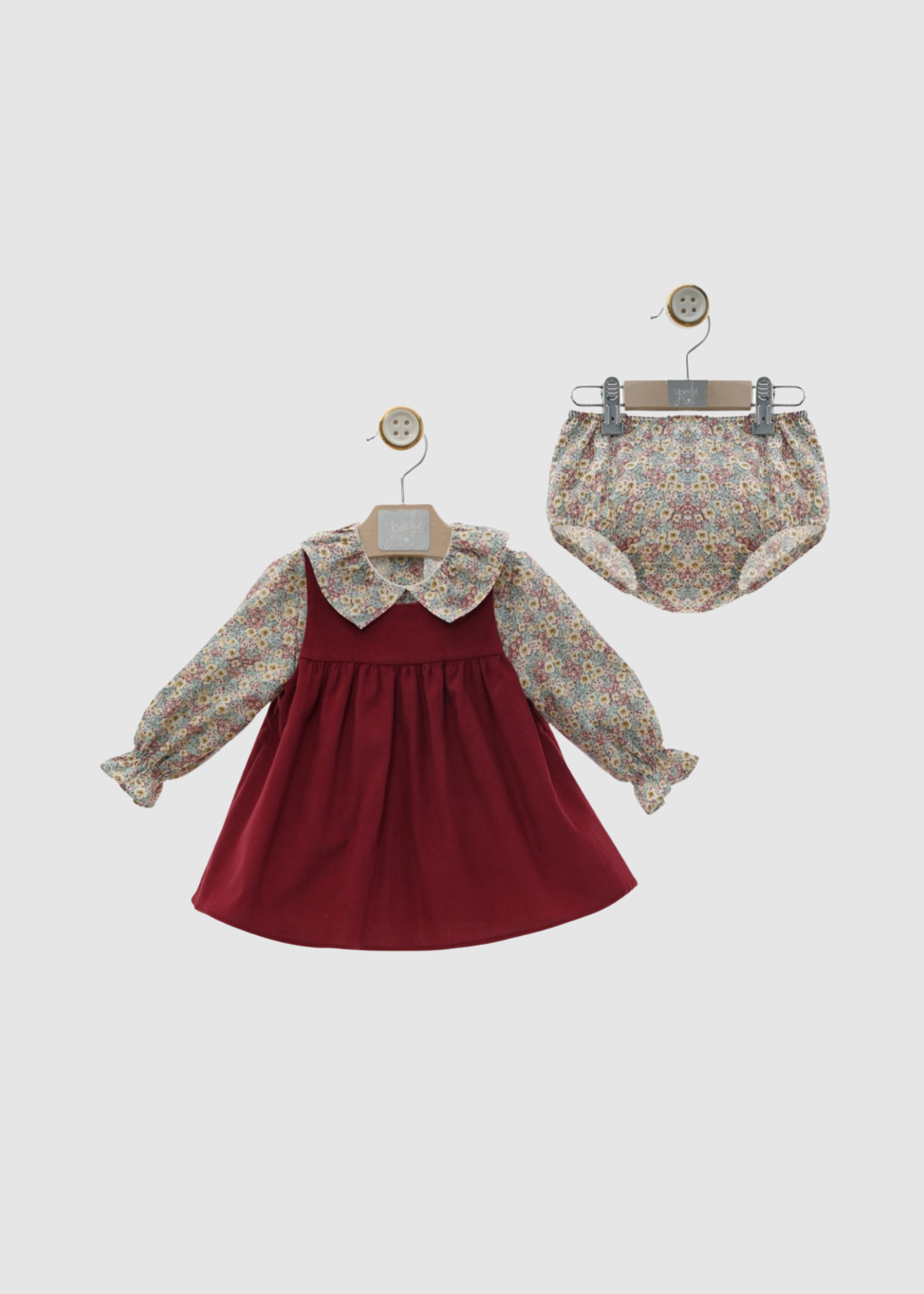 Conjunto de pichi color rojo. Camisa con estampado de flores, y cuello volado. Braguita en tela coordinado.