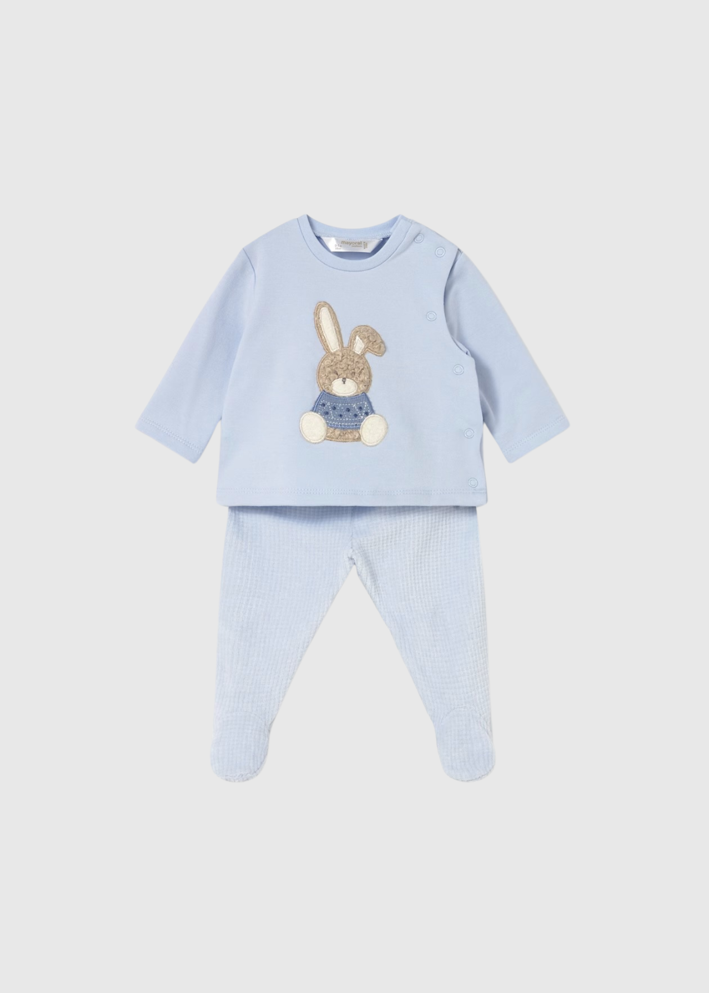 Un dulce conjunto de dos piezas con una camiseta de manga larga azul claro con un conejito bordado, a juego con pantalones texturizados con pies.