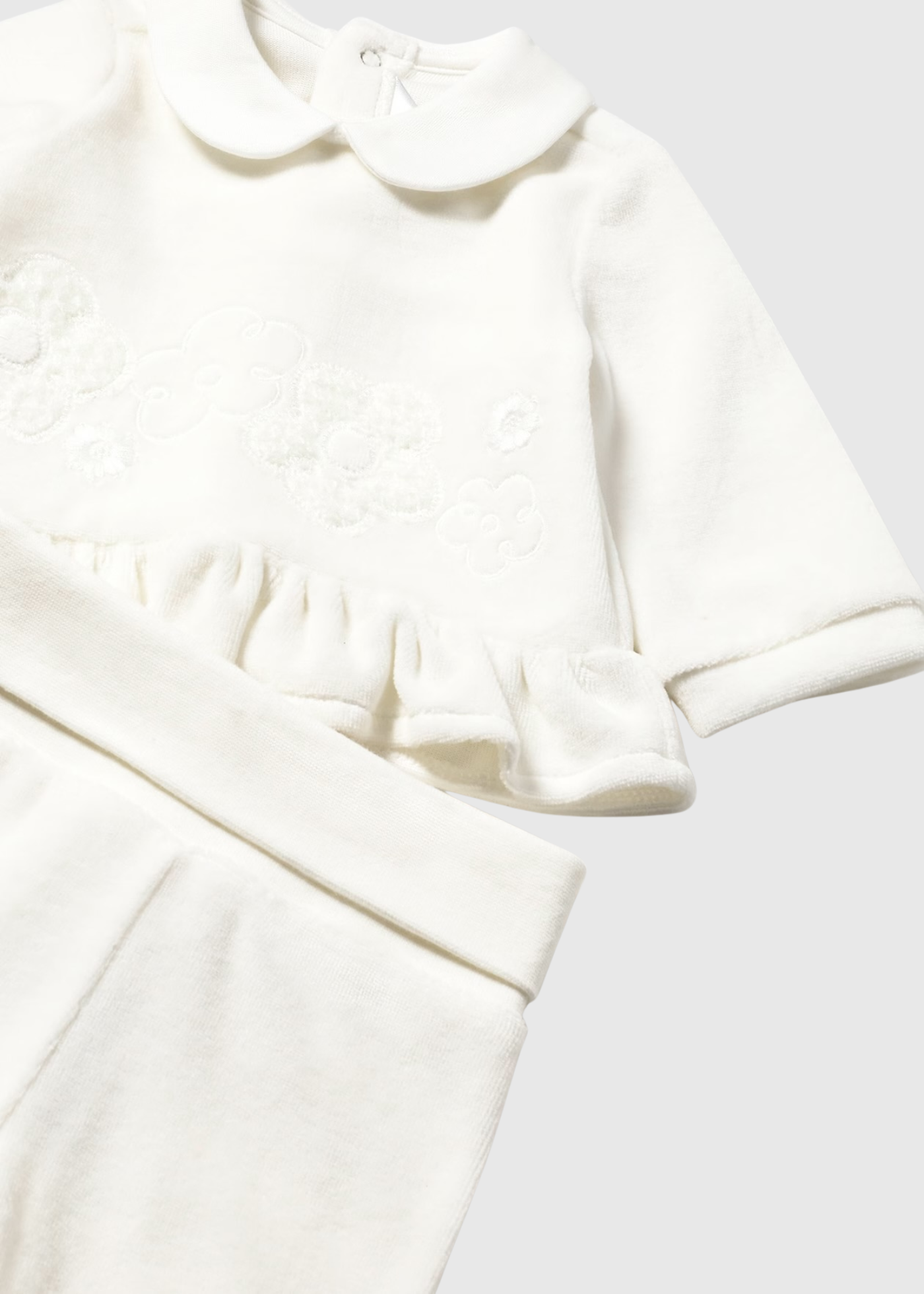 Un clásico atuendo de dos piezas completamente blanco con una camiseta de manga larga con volantes y delicados bordados, combinada con pantalones con pies.
