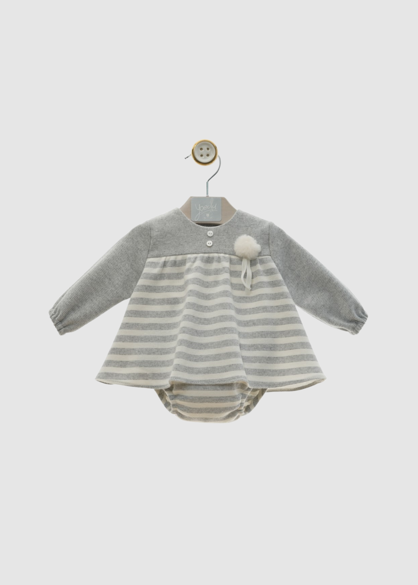 Jesusín en tela invernal. Diseño de rayas blanco y gris con detalle de pompón.