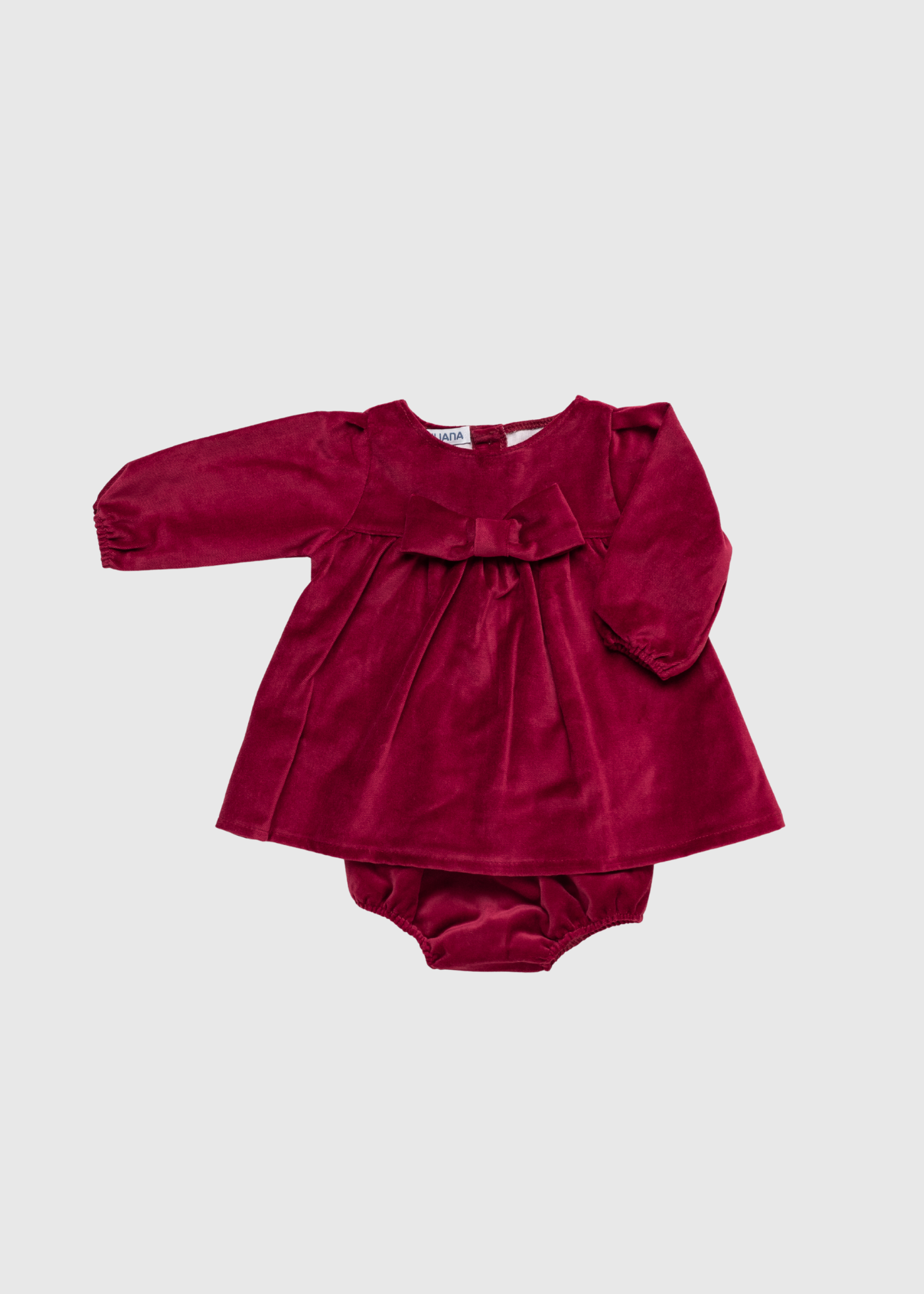 Set de Terciopelo de Lujo. Conjunto de vestido y ranita en suave terciopelo burdeos, adornado con un gran lazo frontal. Perfecto para eventos festivos.