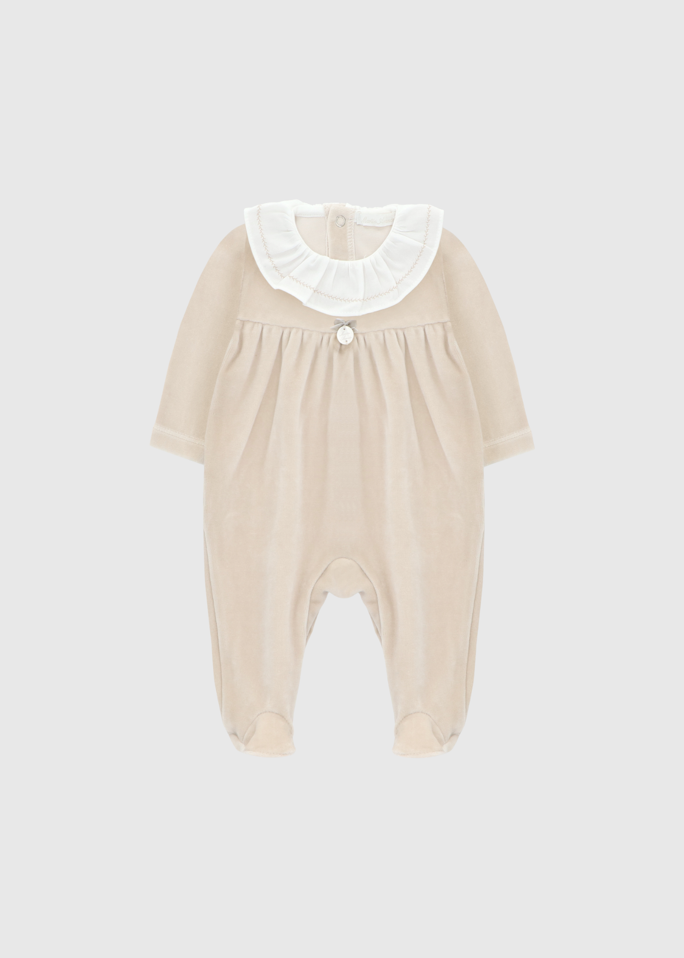 Un tierno mameluco de terciopelo, realzado con un delicado cuello de encaje y puños fruncidos. La opción más adorable para un look dulce y confortable.