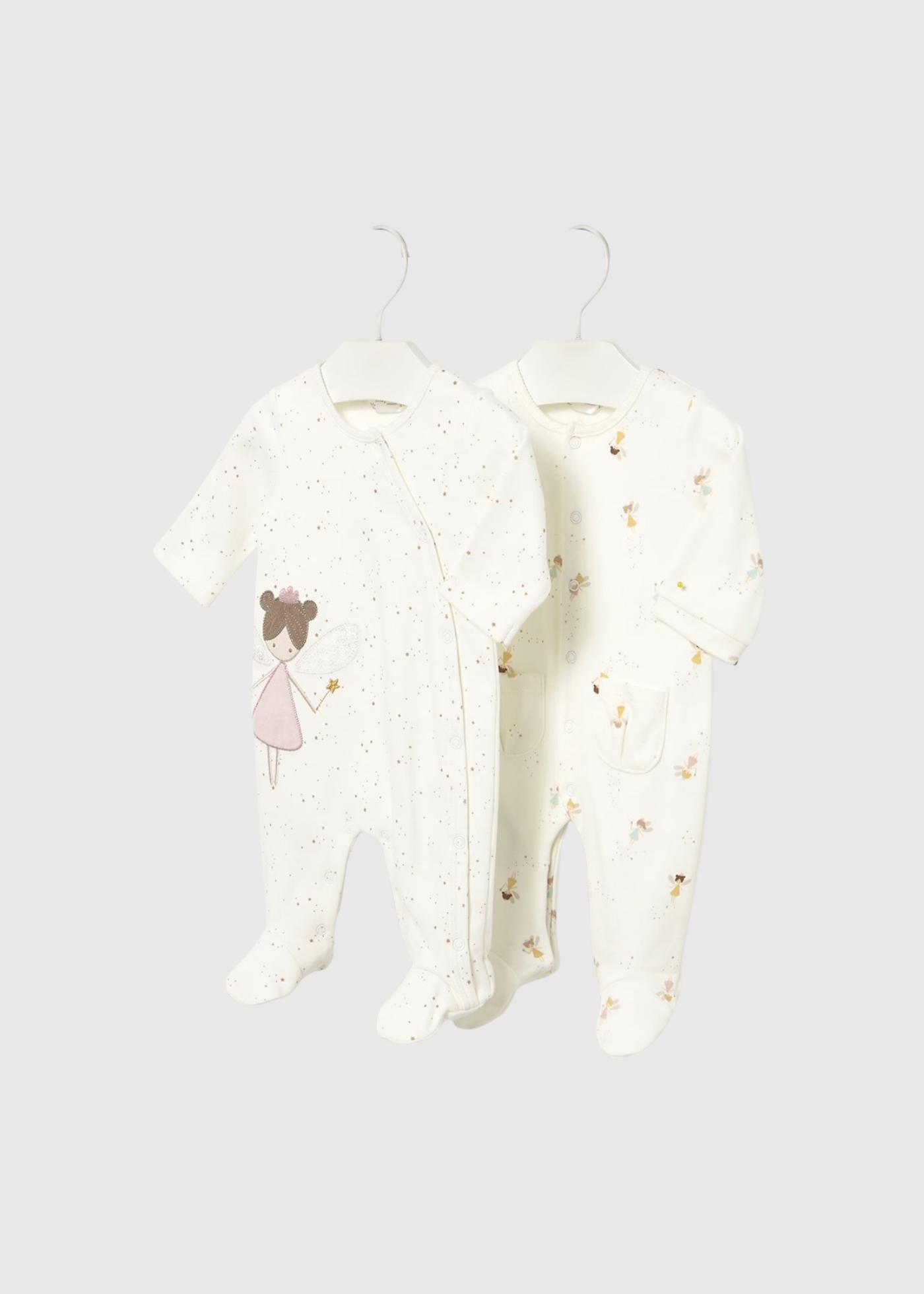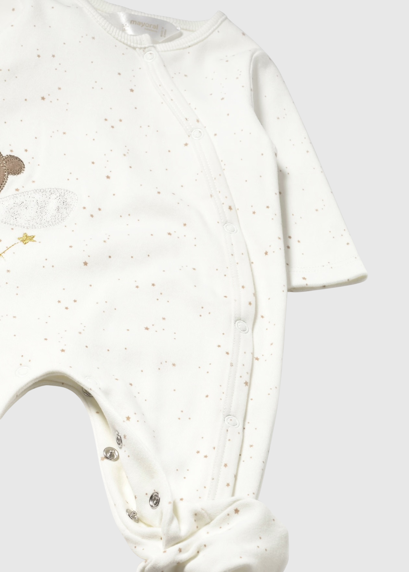 Un pelele con pies. Con gran gráfico de hada sobre un fondo claro, super cómodo para tu nena.