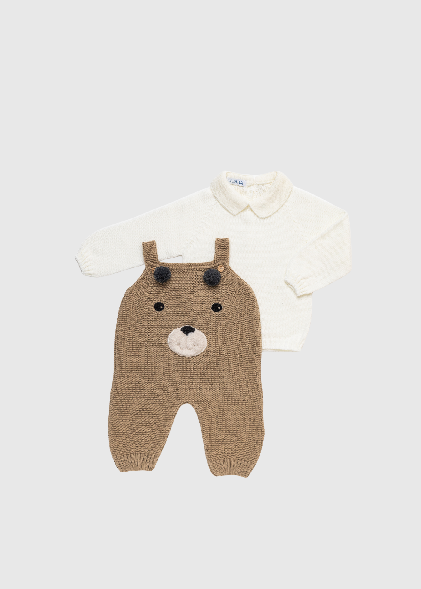 Peto de punto color camel con diseño de oso en relieve y orejas 3D. Se combina con un jersey de punto blanco roto con cuello.