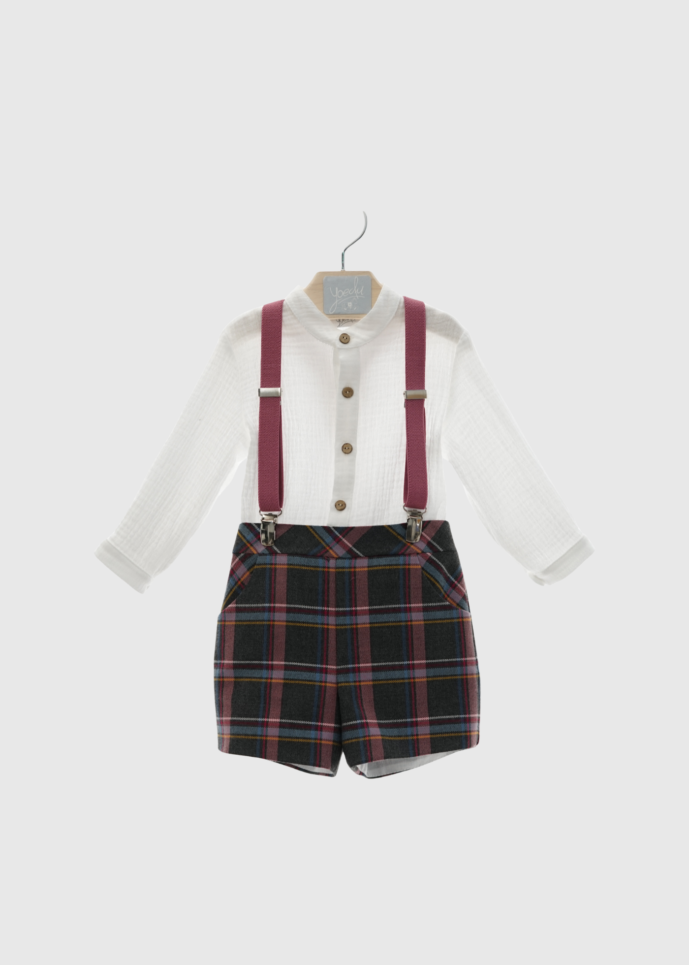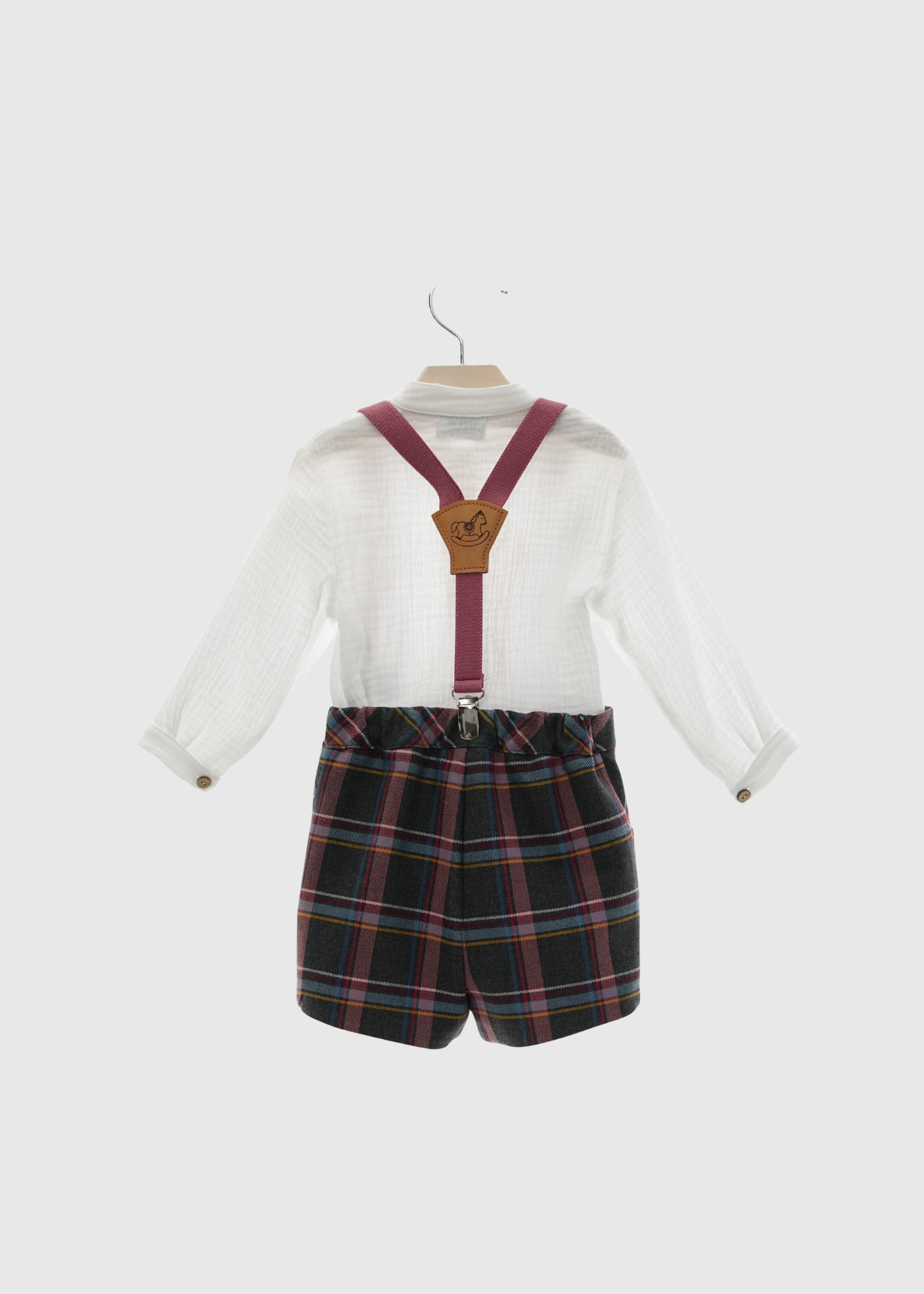 Camisa blanca de botones con textura y short de cuadros oscuros, realzado por tirantes de color vino. Un outfit de gentleman moderno, ideal para fiestas y ceremonias.