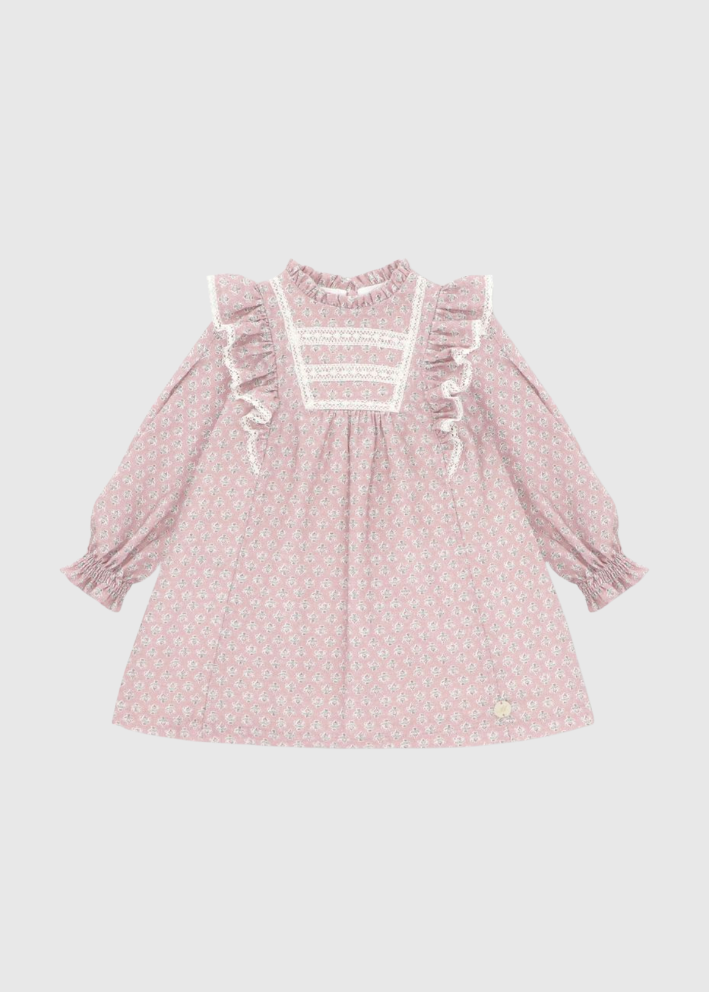 Elegante vestido con estampado floral en tono malva. Su diseño es sofisticado, con un cuello alto y volantes en los hombros adornados con detalles de encaje blanco que le dan un aire romántico y atemporal.