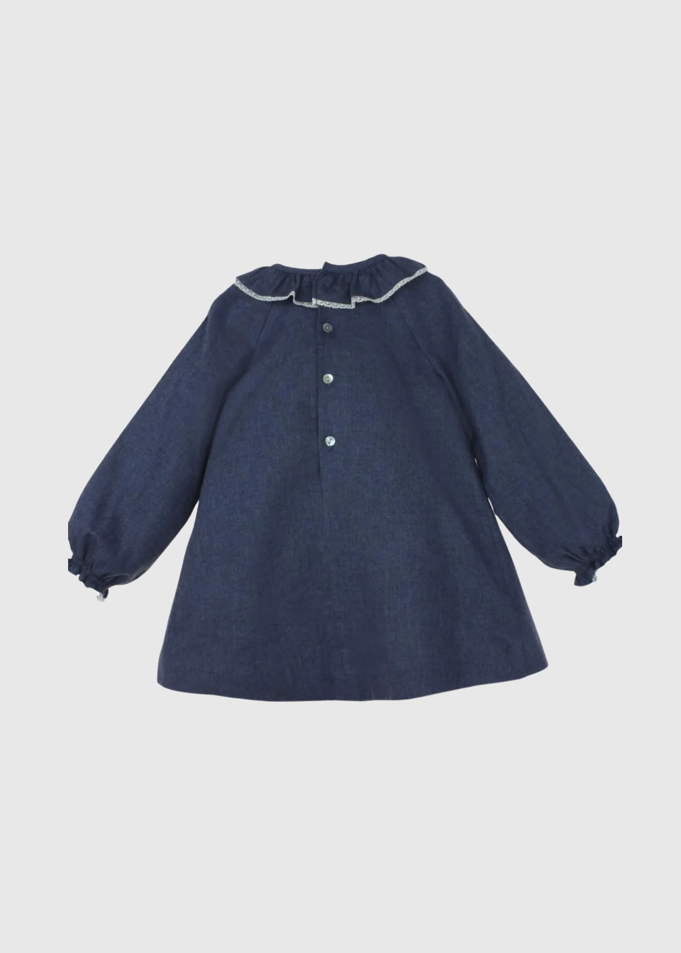 Elegante y funcional, en tejido denim azul presenta un cuello de volante y un exquisito smocke bordado a mano en el pecho. Las mangas largas y la braguita/cubrepañal a juego hacen de este conjunto un clásico coqueto y abrigado para las más pequeñas.