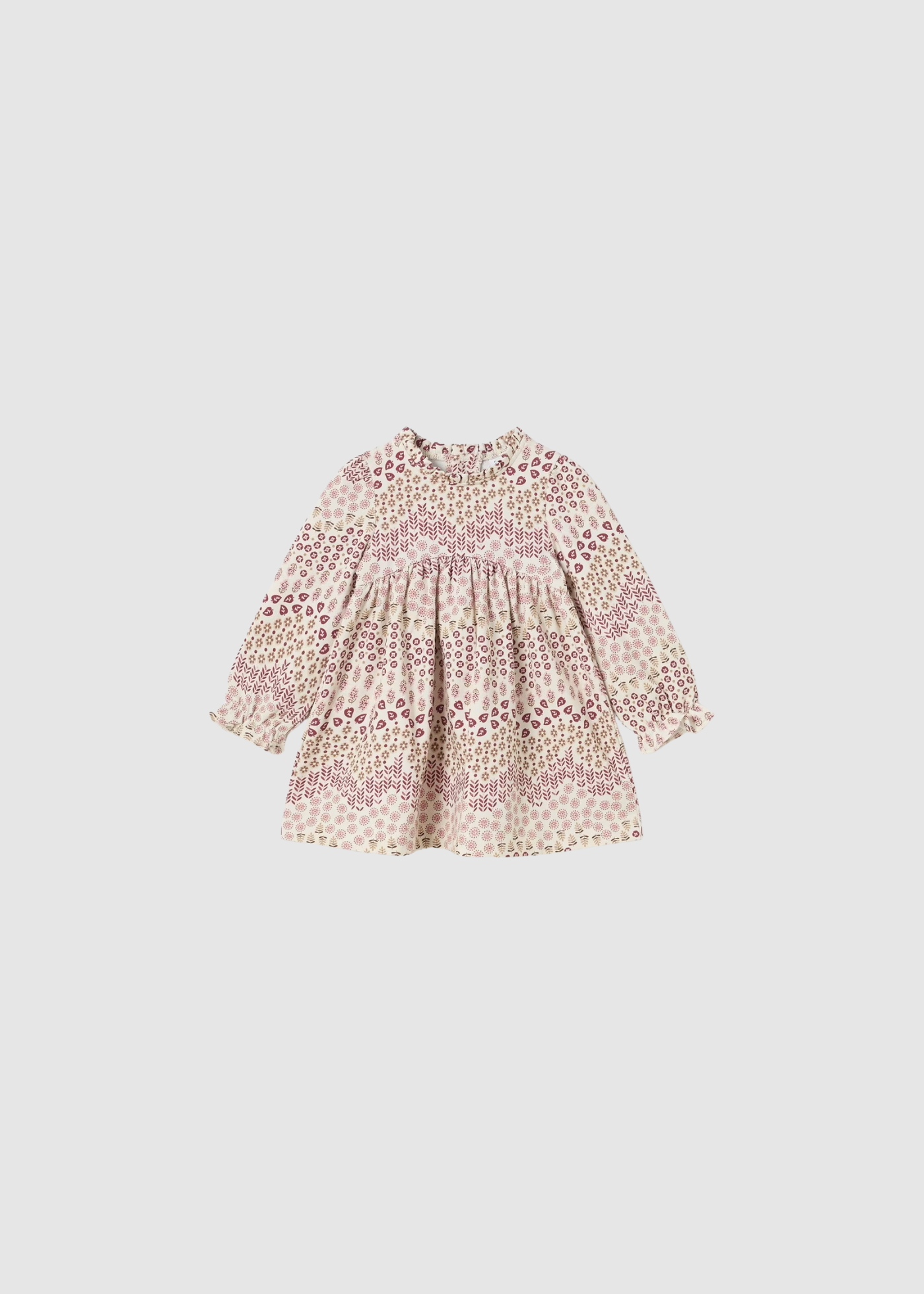 Vestido de manga larga en color garbanzo con print de hojas en tonos rojos y rosas.