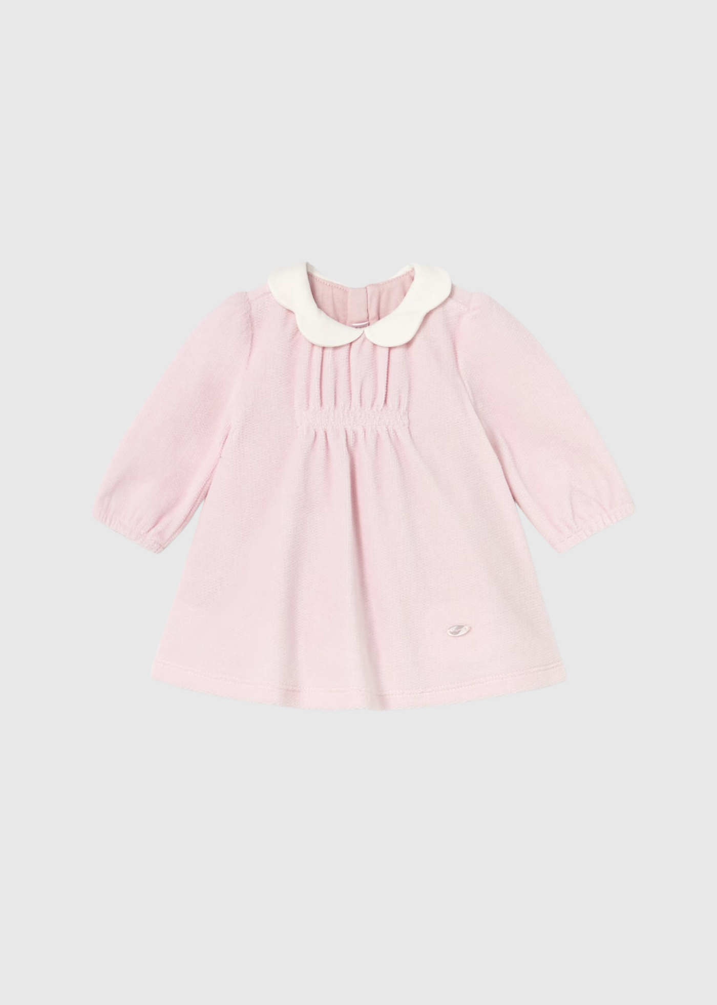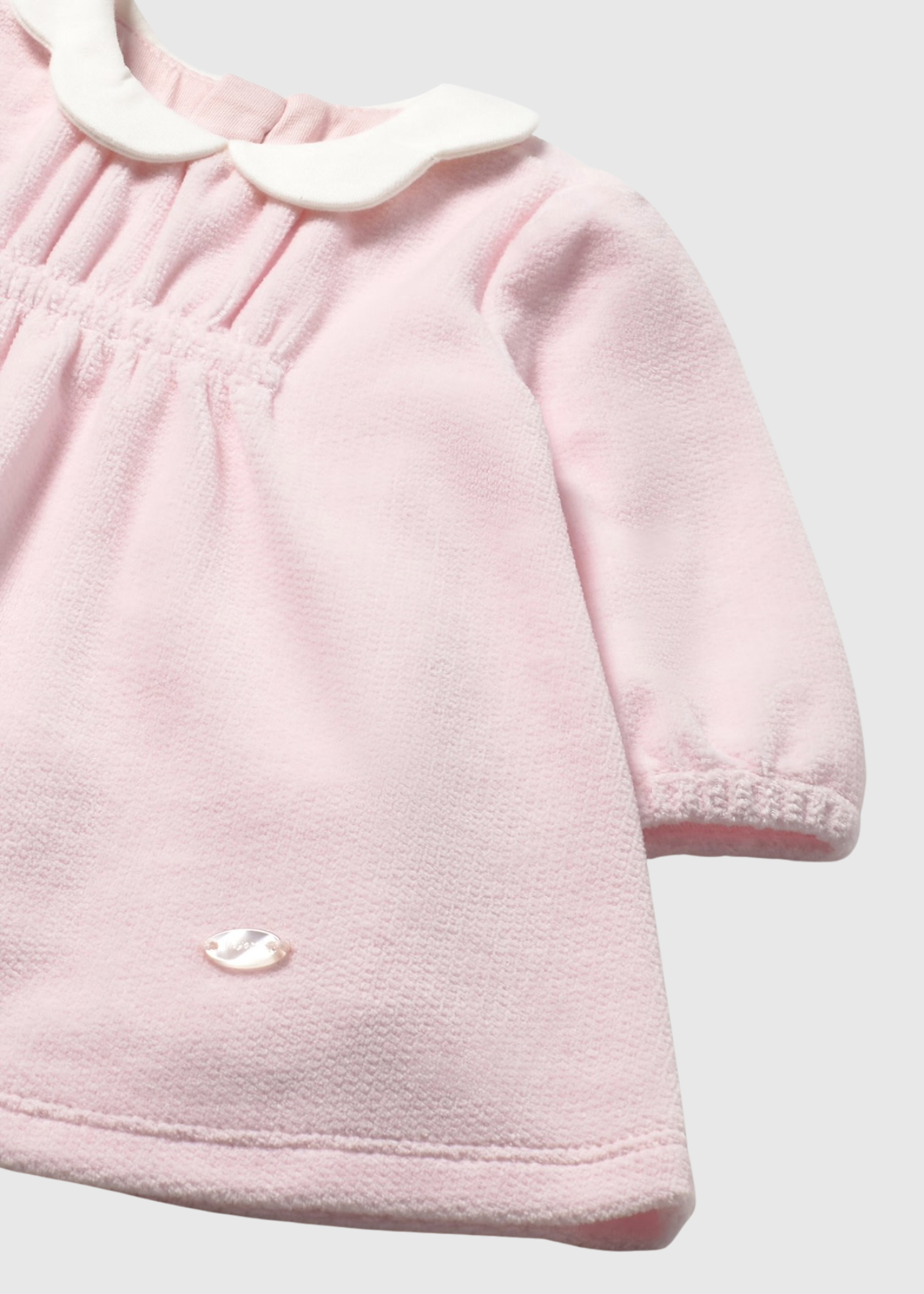Un vestido rosa de manga larga hecho de pana fina, perfecto para el uso diario. El cuello blanco de estilo Peter Pan y los pliegues en el pecho le dan un acabado adorable y clásico.